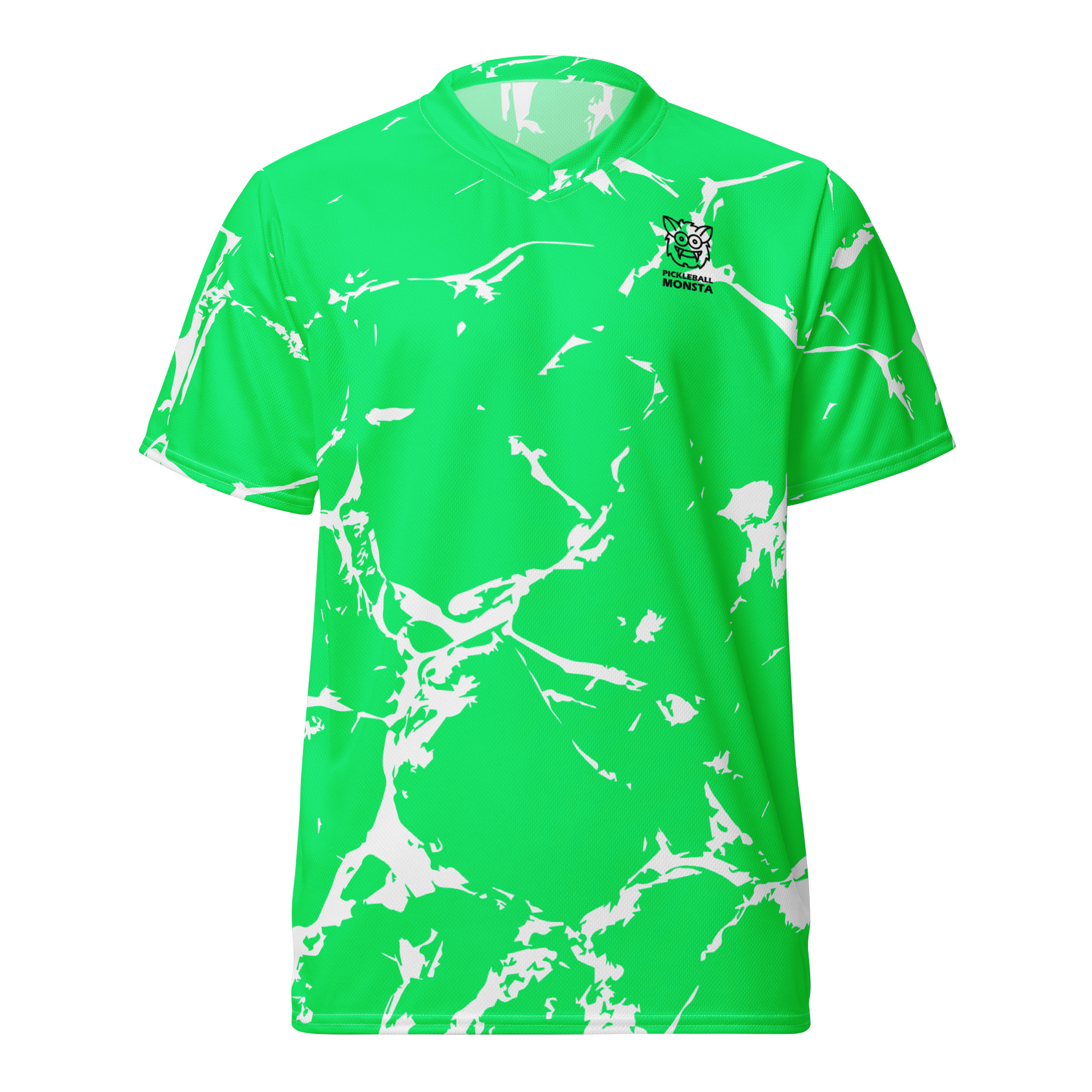 Pickleball Monsta Unisex Short Sleeve Jersey – Splatter – White on Moss